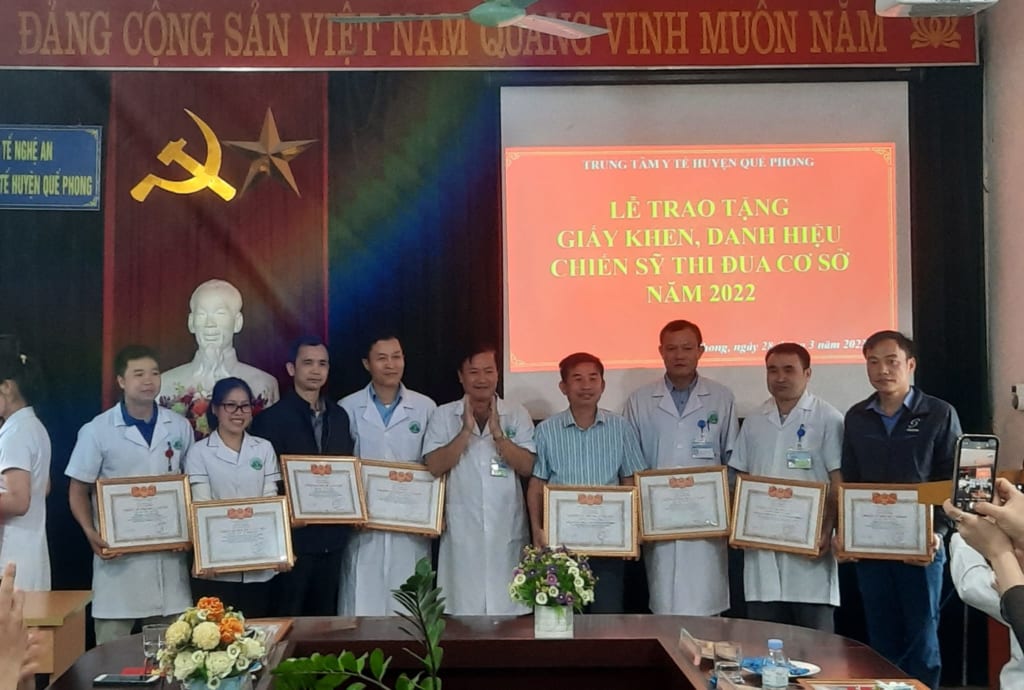 Thực hiện Quyết định số: 2360/QĐ-SYT ngày 29/12/2022 về việc tặng danh hiệu chiến sỹ thi đua cơ sở năm 2022, Quyết định số: 2358/QĐ-SYT ngày 29/12/2022 về việc tặng giấy khen năm 2022 của Sở Y tế tỉnh Nghệ An, chiều ngày 28/3/2023 Trung tâm Y tế Quế Phong đã tổ chức lễ trao danh hiệu chiến sỹ thi đua cơ sở cho 33 cá nhân, trao giấy khen của Giám đốc Sở Y tế cho 38 cá nhân và 6 tập thể khoa, phòng, trạm y tế.